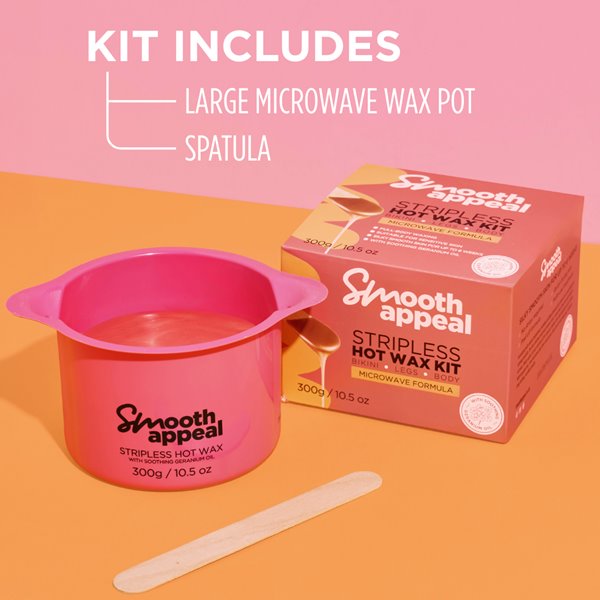 - Smooth Appeal 300g Microwave Stripless Hot Wax Kit offers salon-quality hair removal in the comfort of your home. This professional-grade formula is enriched with soothing geranium oil, making it ideal for sensitive skin. The larger 300g tub is perfect for multiple treatments and various body areas including the legs, arms, bikini and more.